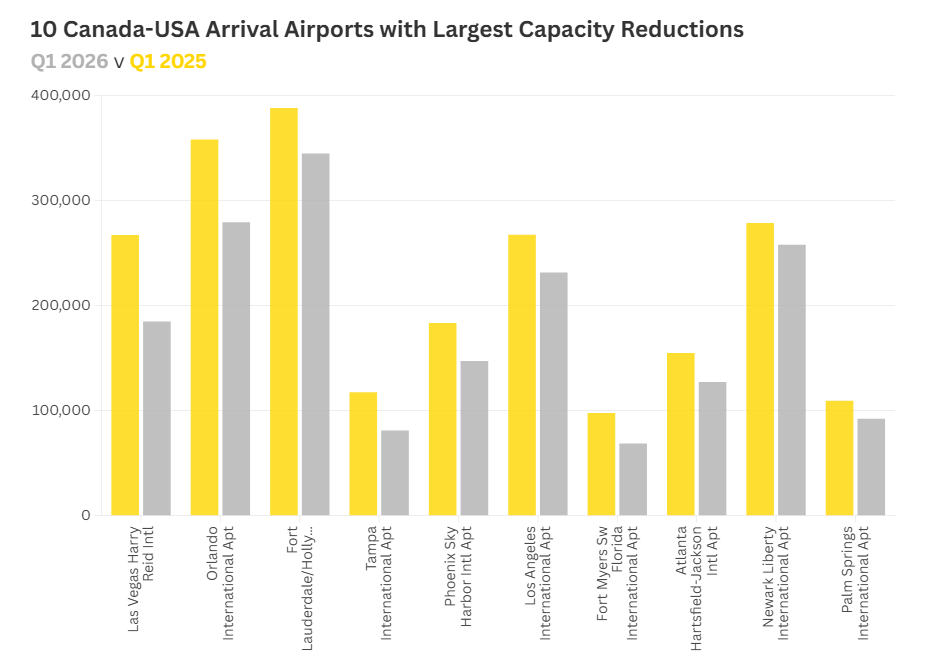 The 10% reduction in U.S.-bound capacity year-on-year equates to almost 450,000 fewer seats in Q1 2026, or nearly 5,000 fewer seats each day. Notably, over 95% of these cuts have come from Canadian airlines: WestJet has reduced its capacity by 19%, Air Canada is down by 7%, and Flair Airlines has made the most significant change with a 58% decrease in its U.S.-bound capacity.
