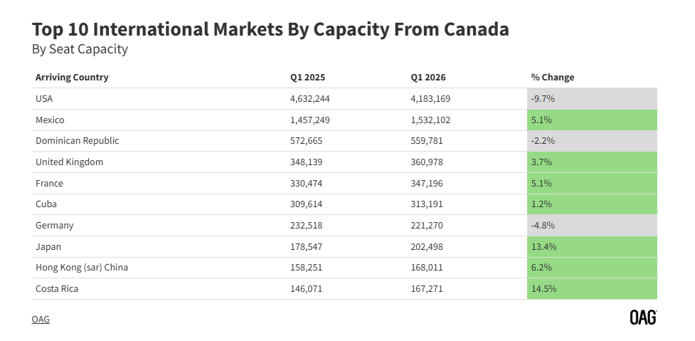 Canada’s international capacity for Q1 2026 is set to be 1% less than in 2025, with 75 international country markets served, one more than in 2025. New services to Israel and Nicaragua are planned