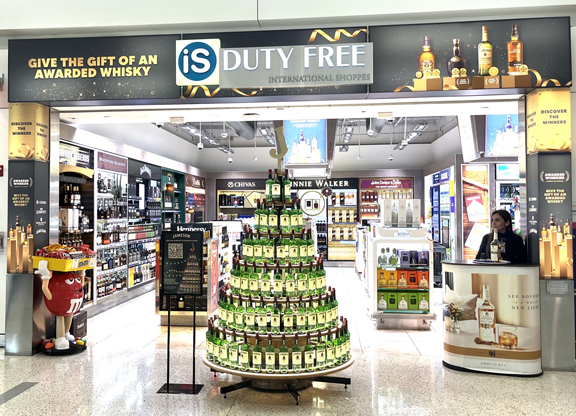 In BOS, running November 26-December 31, the tree grabs attention in the main duty free store, placed next to the bar where the promoter samples various SKUs, creating a lively and engaging display.